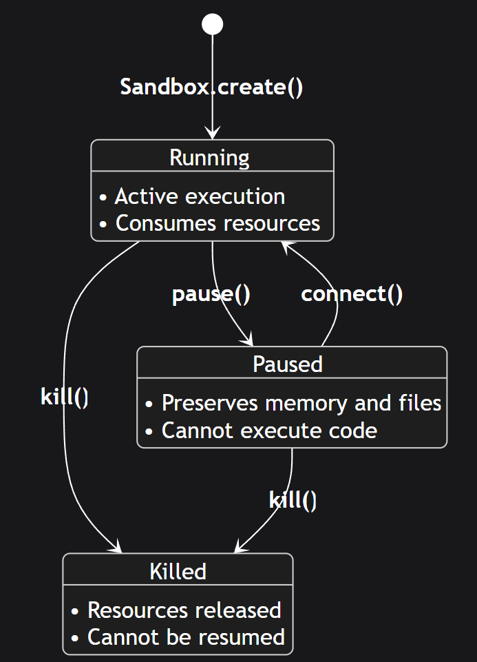 • Running: The sandbox is actively running and can execute code. This is the initial state after creation.